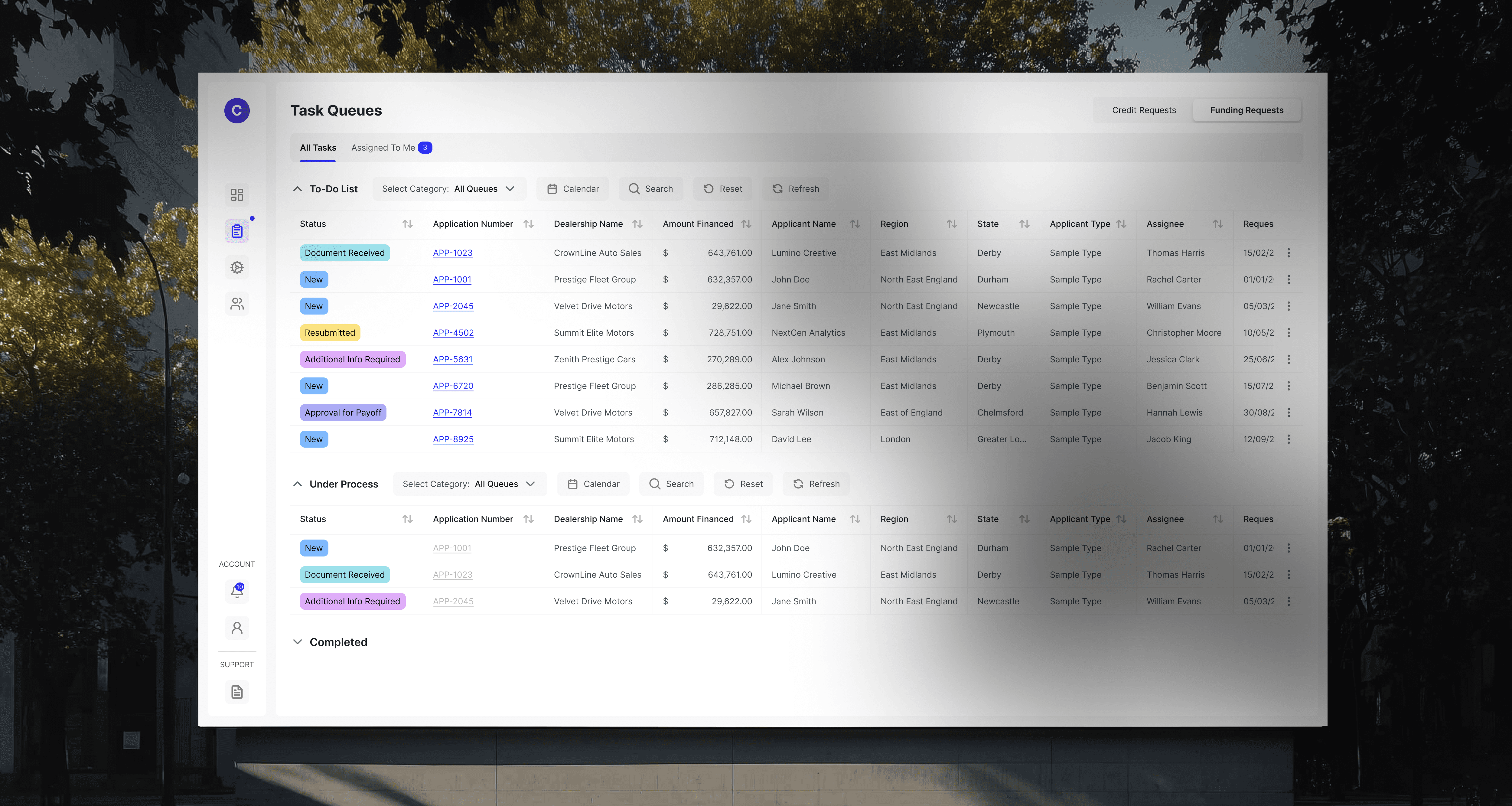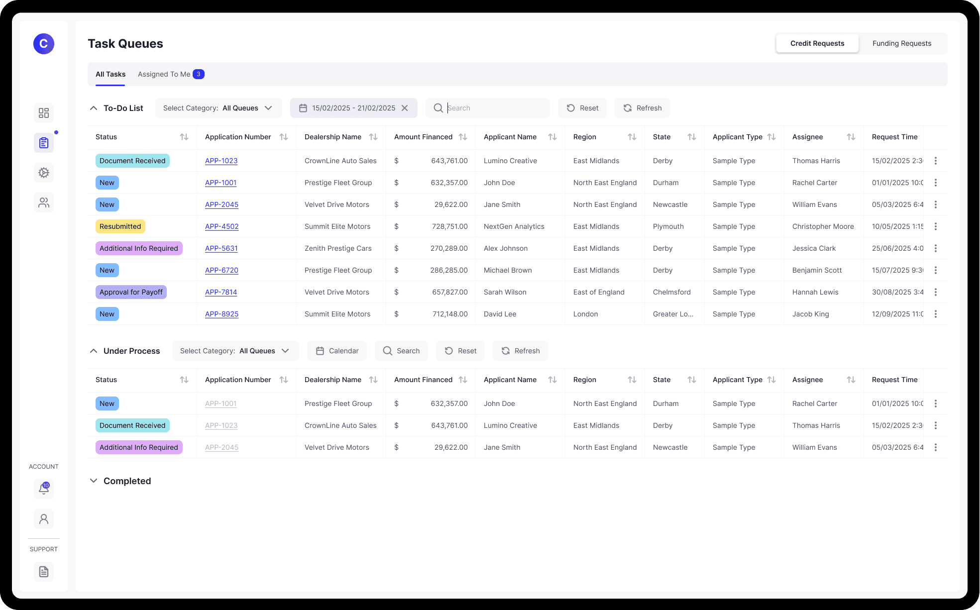 Funding Analysts can validate documents, review compliance checks, and manage payouts. Designed for efficiency, the dashboard ensures every approved deal moves smoothly from decision to funded status, reducing delays and boosting accuracy.
