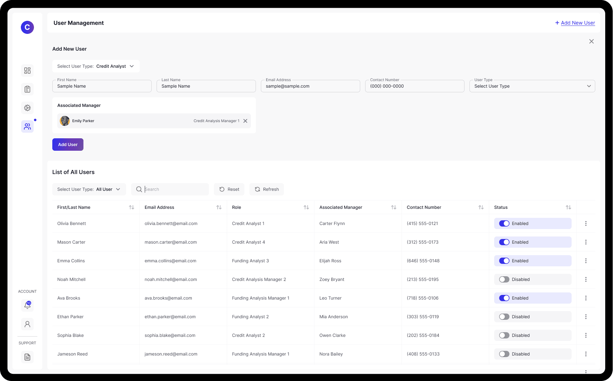 Define roles, assign permissions, and control access whether for credit analysts, funding teams, or managers. A secure, scalable solution to manage your growing operation.