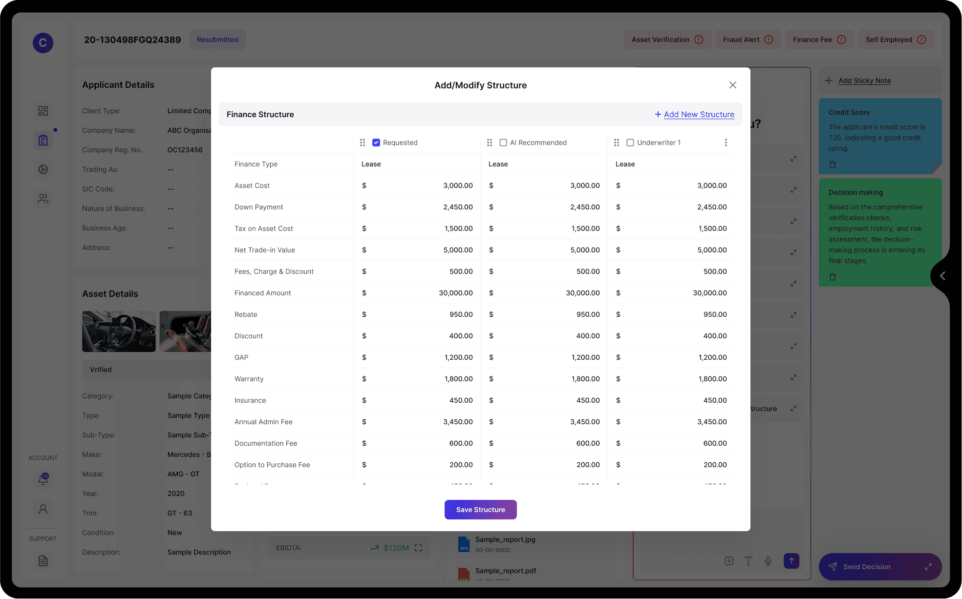 The Credit Analyst screen empowers analysts to review applicant profiles, like financial insights, and risk indicators in one place. With tools like AI-powered recommendations, and structure comparison, analysts can approve, decline, or adjust deals confidently. The design focuses on clarity and speed, ensuring every decision is both accurate and compliant.